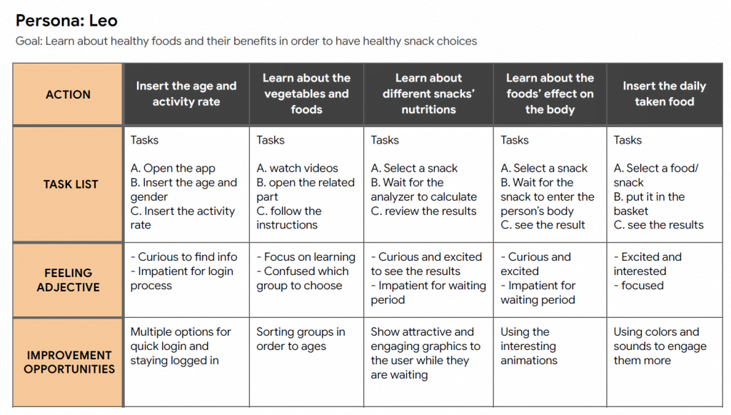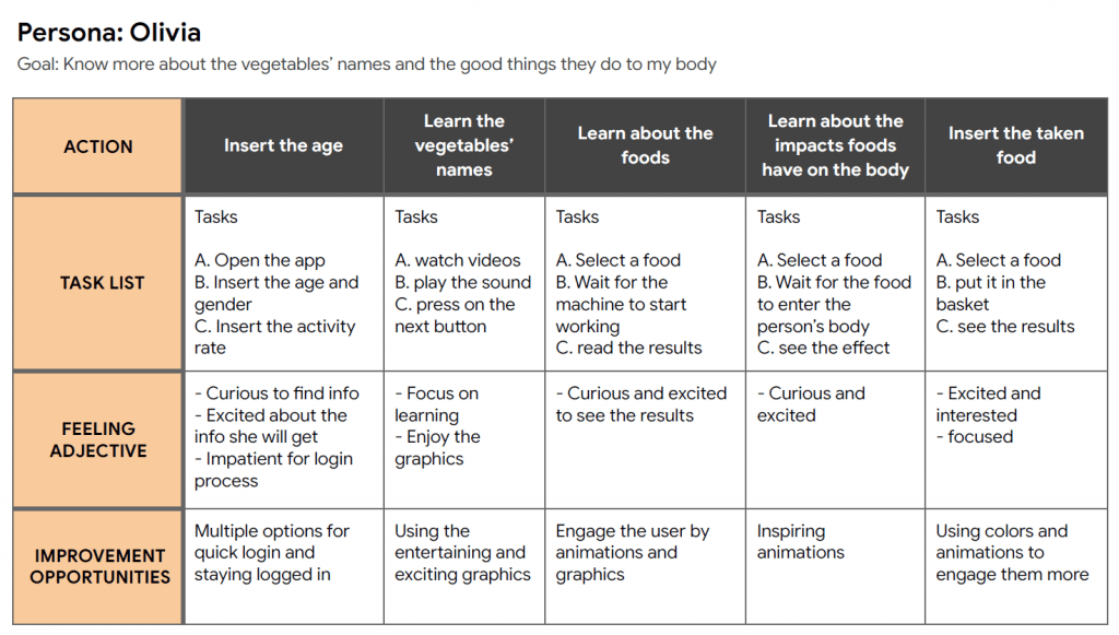 The interviewees were kids who were guiding by their parents. The interviews were focused on what is the kids attitude towards healthy eating and what is their knowledge of nutrition. I wanted to discover if there were any games, applications, or programs already in use. It was also important to find out what digital medium users use. Their parents answered to a few complimentary questions about how the above-mentioned programs work and if they didn’t, then why. They also provided me with information about if their children are picky eaters, if they have any struggles with them eating the specific food, and the overall eating habits of their kids.