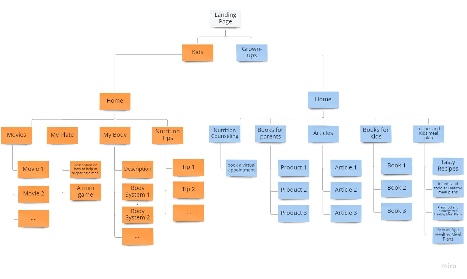 It was observed in the interviews that parents also have tendency towards using a nutrition website where they can have access to nutrition articles about kids. Alongside with this, kids are more willing to browse the website on the tablet or use the mobile app. Meanwhile, the parents are the target users of the desktop version and mobile version of the website. Therefore, I decided to design the website for both user groups and I used the split screen layout for my landing page.